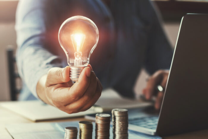 businessman hand holding lightbulb with using laptop and money s