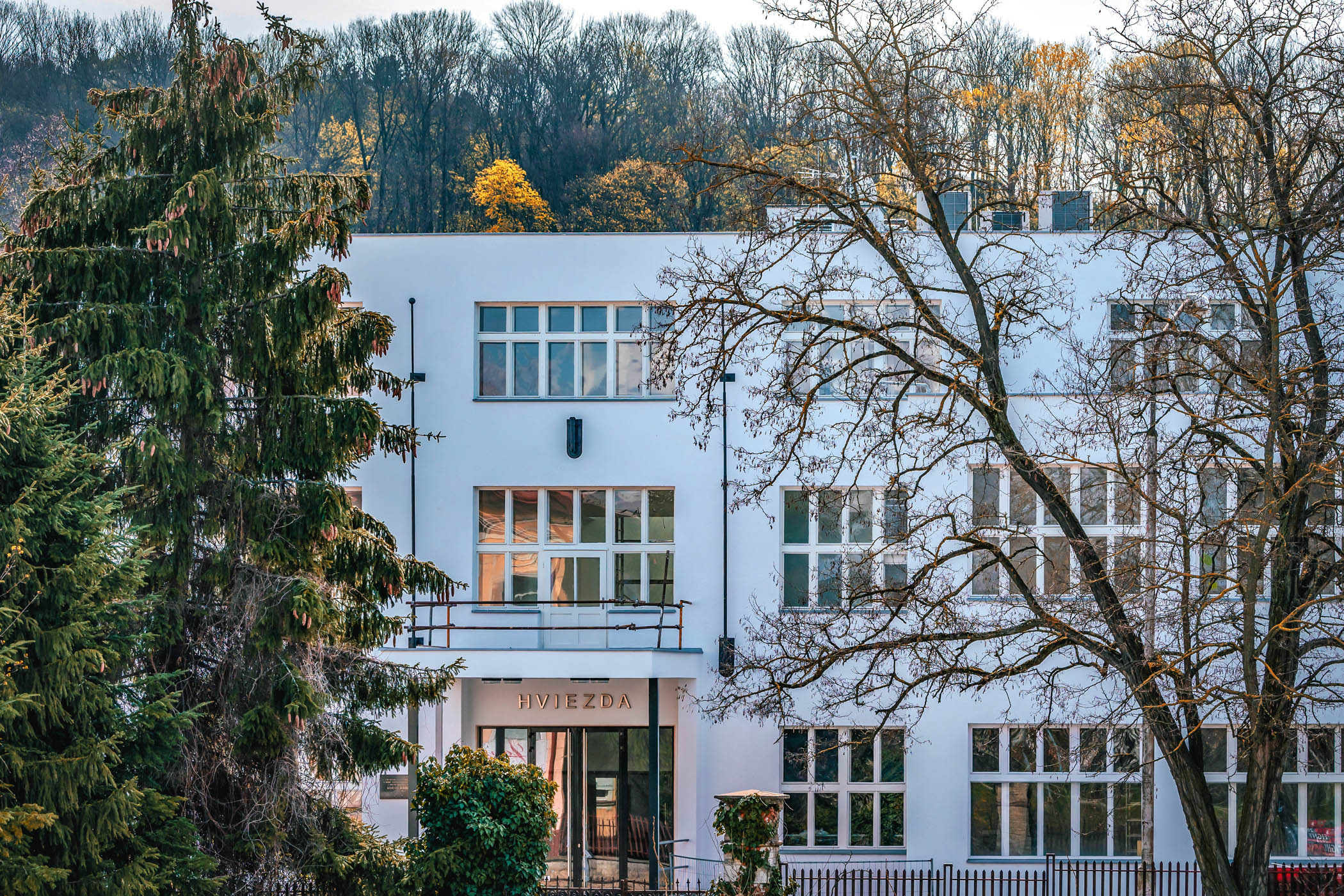 budova Hviezdy spoza stromov