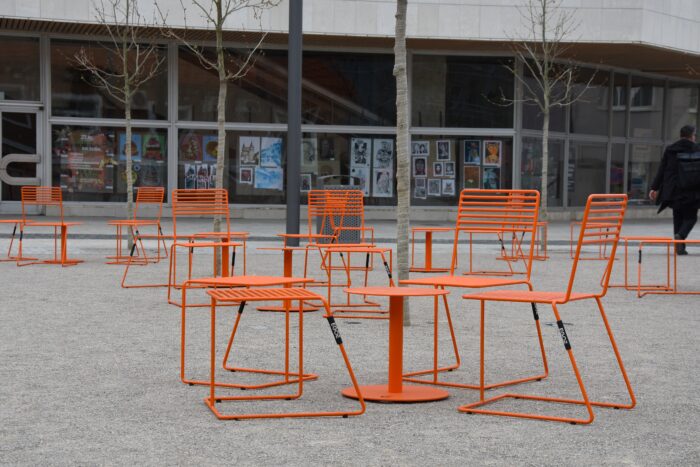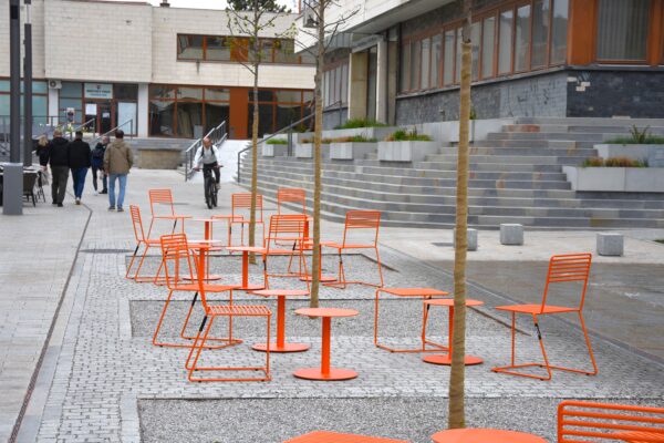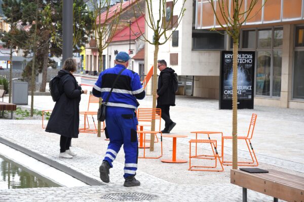 Ale ešte späť k oranžovému mobiliáru, ktorý nie je pevne pripevnený a môžete si ho prispôsobiť, premiestniť podľa počtu vašich priateľov, s ktorými si budete chcieť na stoličkách posedieť. Skúsme si dohodnúť nepísané pravidlá, že všetky stoličky a stolíky zostanú v pešej zóne a budú všetkým dlho v plnom počte slúžiť počas celej sezóny. Pre každý prípad na to bude dohliadať kamerový systém. Ďakujeme za porozumenie.