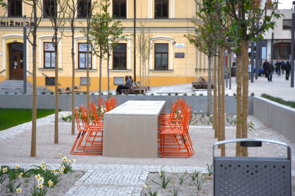 Sety stolíkov a stoličiek s operadlom i bez nájdete pri novej fontáne i v parčíku pri Posádkovom klube. Môžu slúžiť na oddych, na popíjanie kávy, na čítanie kníh a podobne.