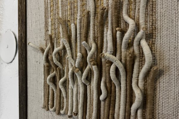Textilná výtvarníčka Milada Ždrnja tvorí diela inšpirované prírodou a rôznymi prírodnými štruktúrami. V jej umeleckom portfóliu nájdeme monumentálne objekty, ale aj subtílne textilné obrázky. Používa rôzne materiály a rôznu hustotu tkania – od ľanového plátna cez vlnu až po konopné vlákna a povrazy, od transparentných závojov až po hutné tapisérie. Do svojich diel zatkáva zozbierané fragmenty prírody – kamienky, drievka – a povyšuje ich na artefakty. Na aktuálnej výstave prezentuje diela, ktoré sú inšpirované zimnou krajinou a riekou Váh, určujúcim prírodným fenoménom Trenčína.