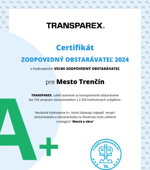 V hodnotení, ktoré realizoval portál TRANSPAREX., sme získali nadpriemerné hodnotenie A+ a Certifikát zodpovedného obstarávateľa 2024 s hodnotením veľmi zodpovedný obstarávateľ.