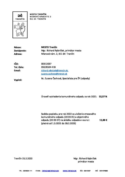 Hlavná stránka > Pre občanov > Odpady a životné prostredie > Odpady > Potvrdenie % vytriedenosti za 2021