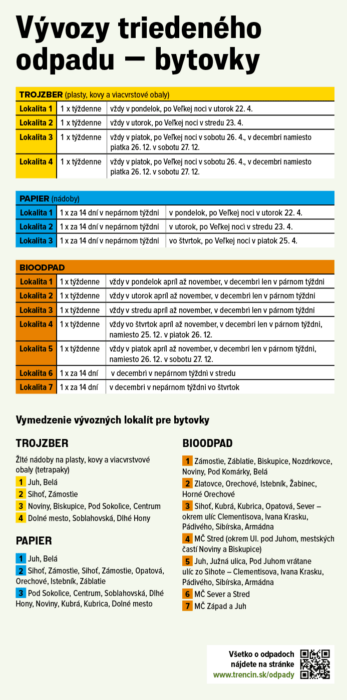 Harmonogram vývozu odpadu Trenčín 2025 je určený obyvateľom mesta, ktorí chcú mať prehľad o termínoch zberu triedeného odpadu a bioodpadu. Mesto Trenčín zabezpečuje triedený zber prostredníctvom farebne odlíšených kontajnerov: