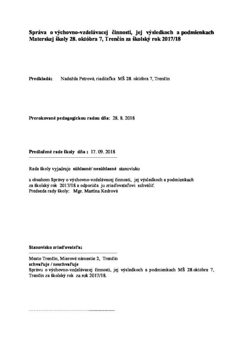Správa o výchovno-vzdelávacej činnosti v MŠ 28. októbra, 2017/2018