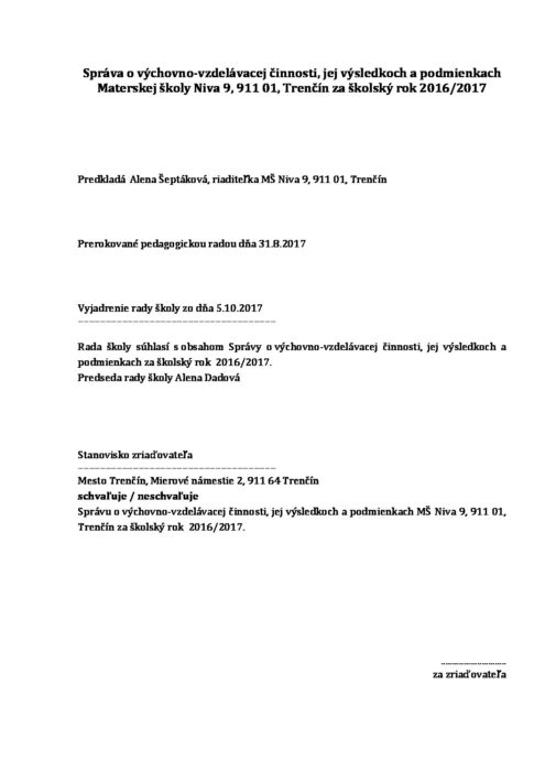Správa o výchovno-vzdelávacej činnosti v MŠ Niva 9, 2016/2017