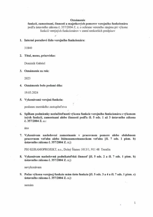 Hlavná stránka > Samospráva > Mestské zastupiteľstvo > Majetkové priznania poslancov > Dominik Gabriel