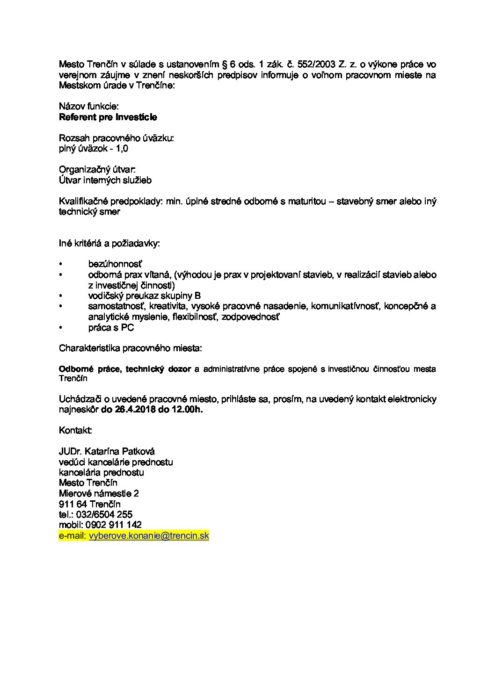 Hlavná stránka > Samospráva > Mestský úrad Trenčín > Voľné pracovné miesta > Referent pre investície 2018 apríl