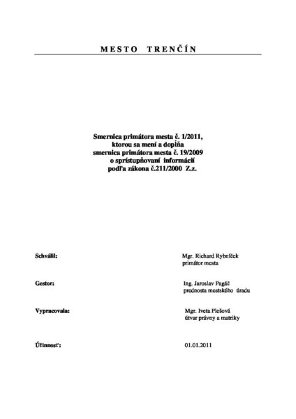 Smernica primátora mesta č.1:2011, ktorou sa mení a dopĺňa smernica primátora mesta č.19:2009 o sprístupňovaní informácií podľa zákona č.211_2000 Z.z.