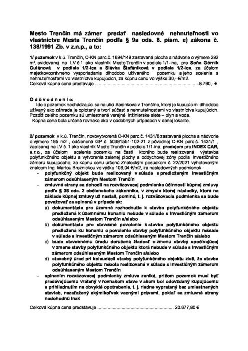Oznámenie o zámere predať nehnuteľný majetok