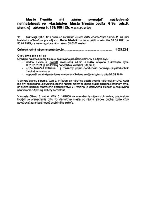 Hlavná stránka > Samospráva > Transparentný Trenčín > Predaj a prenájom majetku > Oznámenie o zámere prenajať byt