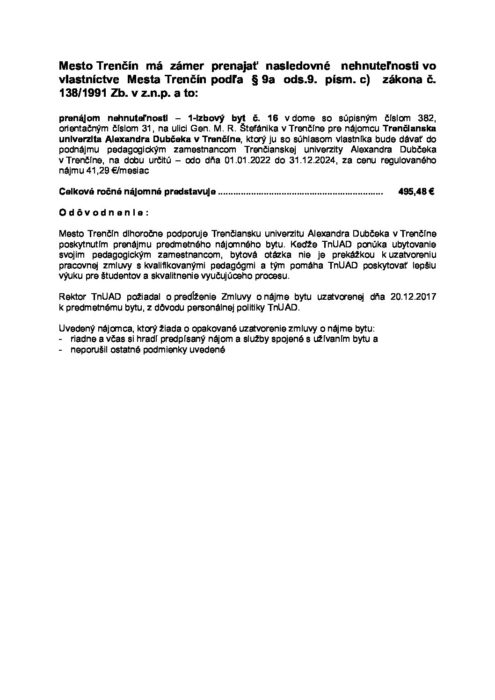 Oznámenie o zámere prenajať byt – Gen.M.R. Štefánika 382