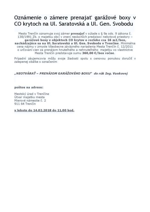 Oznámenie o zámere prenajať garážové boxy v CO krytoch na Ul. Saratovská a Ul. Gen. Svobodu