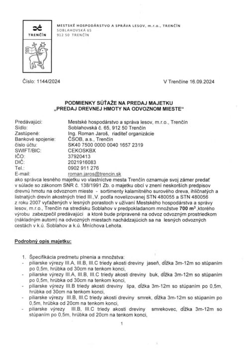 Podmienky súťaže na predaj drevnej hmoty – Soblahov