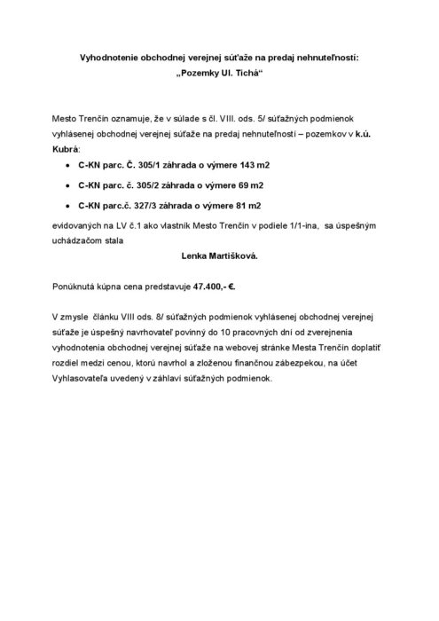 Hlavná stránka > Samospráva > Transparentný Trenčín > Predaj a prenájom majetku > Vyhodnotenie obchodnej verejnej súťaže