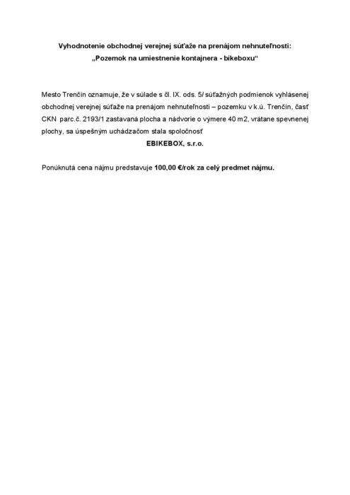 Hlavná stránka > Samospráva > Transparentný Trenčín > Predaj a prenájom majetku > Vyhodnotenie obchodnej verejnej súťaže