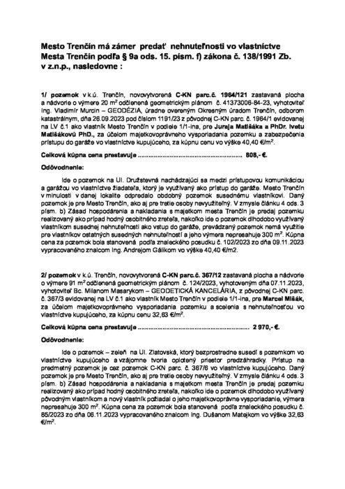 Hlavná stránka > Samospráva > Transparentný Trenčín > Predaj a prenájom majetku > Zámer mesta predať nehnuteľný majetok