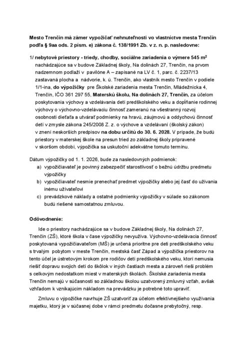 Zámer vypožičať nehnuteľný majetok_MŠ Na dolinách