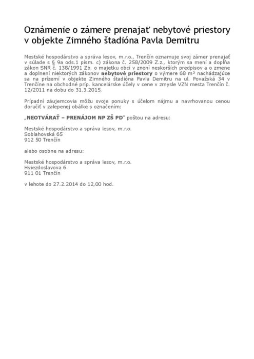 Oznámenie o zámere prenajať nebytové priestory v objekte Zimného štadióna Pavla Demitru