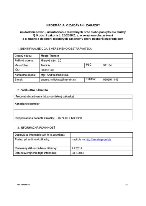 Hlavná stránka > Samospráva > Transparentný Trenčín > Profil verejného obstarávateľa > Archív verejného obstarávania > kancelárske potreby