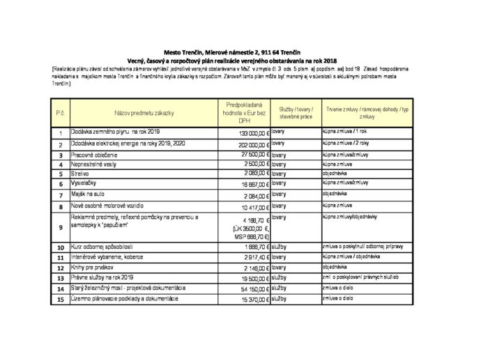 Hlavná stránka > Samospráva > Transparentný Trenčín > Profil verejného obstarávateľa > Plán verejného obstarávania 2018
