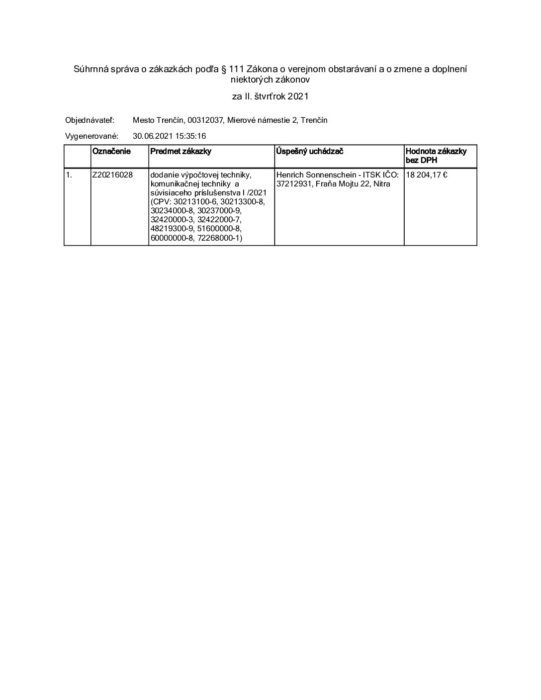 Súhrnná správa o zákazkách za II. štvrťrok 2021