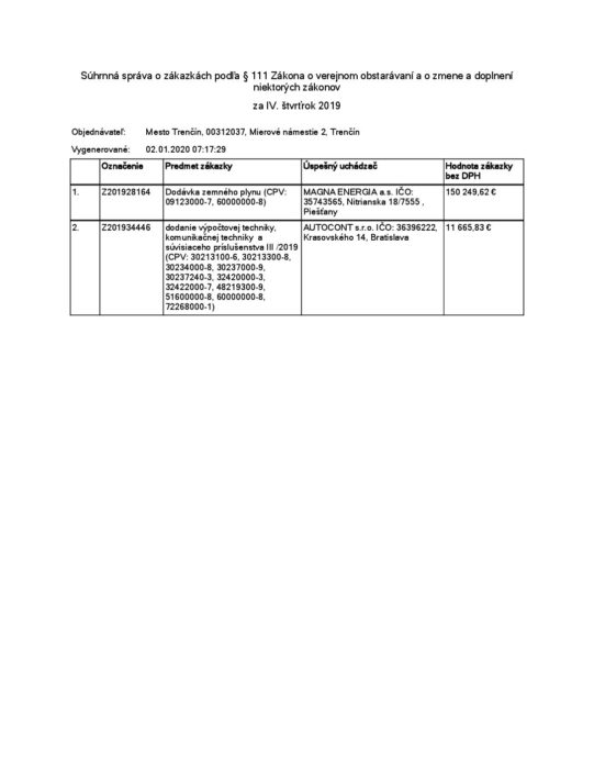 Súhrnná správa o zákazkách za IV. štvrťrok 2019