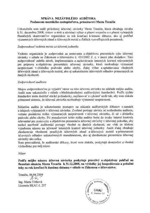 Hlavná stránka > Samospráva > Transparentný Trenčín > Rozpočet mesta > Rozpočet mesta – rok 2008 > Záverečný účet – Sprava_auditora
