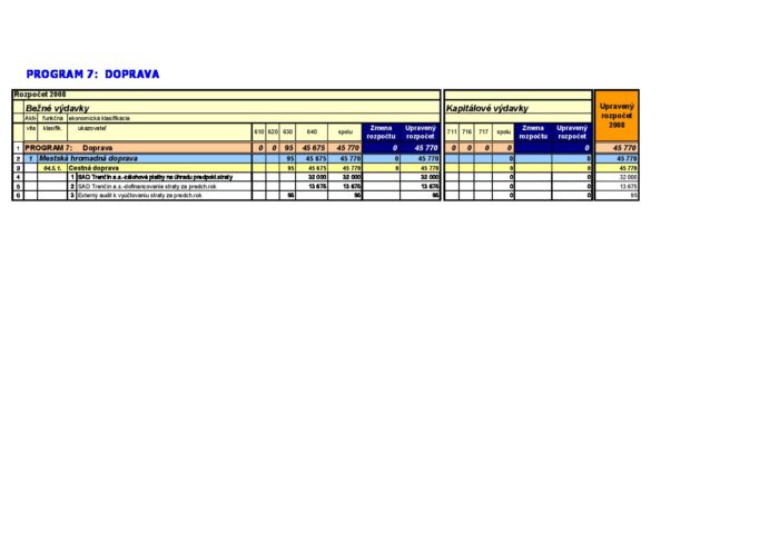 Hlavná stránka > Samospráva > Transparentný Trenčín > Rozpočet mesta > Rozpočet mesta – rok 2008 > Zmena rozpočtu – Program 7 – 2008-10-23