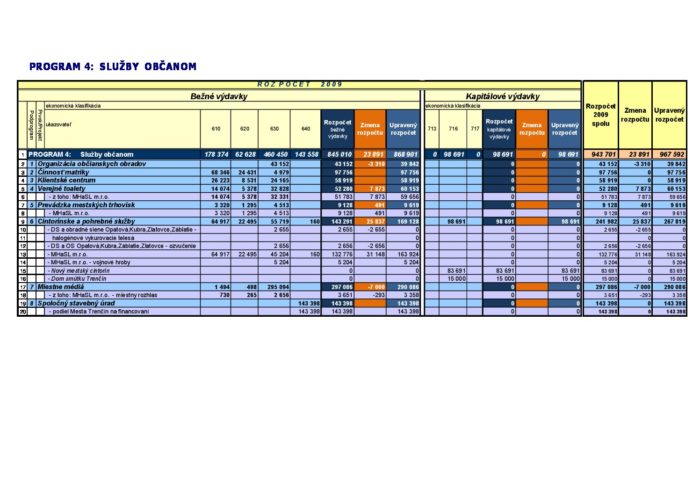 Hlavná stránka > Samospráva > Transparentný Trenčín > Rozpočet mesta > Rozpočet mesta – rok 2009 > Zmena rozpočtu – Program 4 2009-12-17