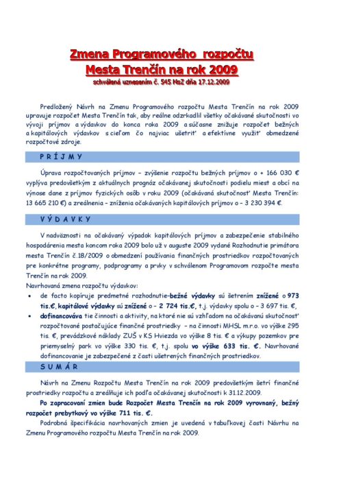 Hlavná stránka > Samospráva > Transparentný Trenčín > Rozpočet mesta > Rozpočet mesta – rok 2009 > Zmena rozpočtu – Zmena text 2009-12-17