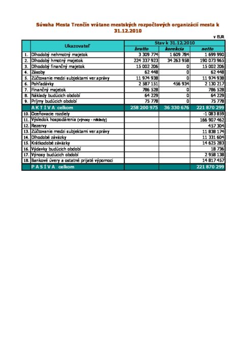 Hlavná stránka > Samospráva > Transparentný Trenčín > Rozpočet mesta > Rozpočet mesta – rok 2010 > Záverečný účet Súvahy