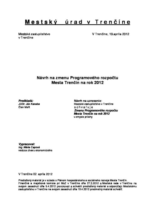 Návrh na zmenu rozpočtu na rok 2012 – MsZ II 19042012