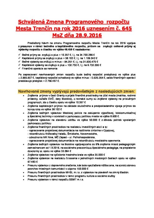Hlavná stránka > Samospráva > Transparentný Trenčín > Rozpočet mesta > Rozpočet mesta – rok 2016 > Schválená zmena rozpočtu MsZ 28092016