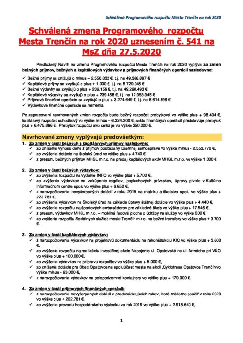 Schválená zmena Programového rozpočtu MsZ27052020