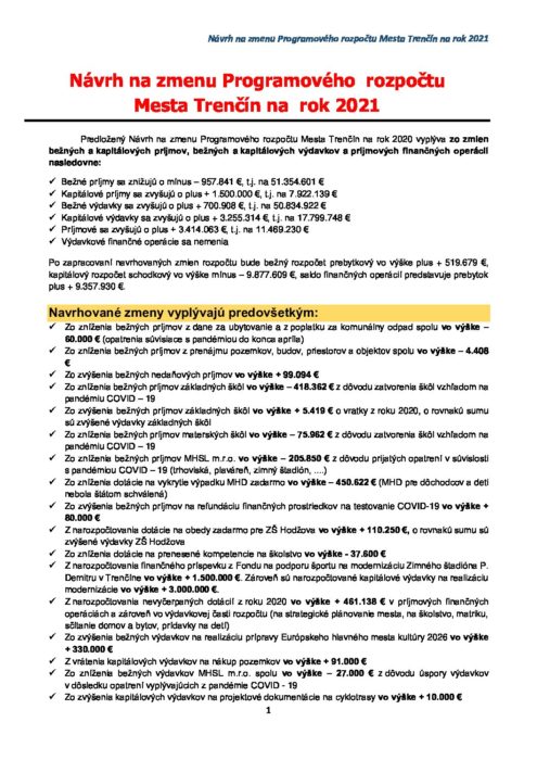 Hlavná stránka > Samospráva > Transparentný Trenčín > Rozpočet mesta > Rozpočet mesta – rok 2021 > Návrh na zmenu rozpočtu MsZ_19052021