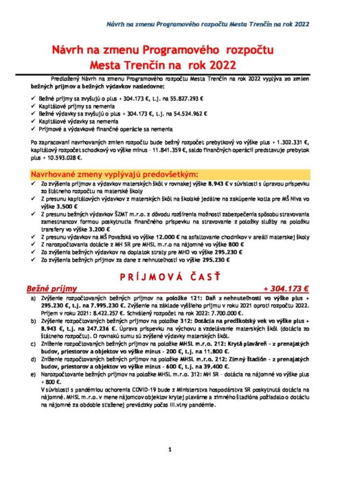 Hlavná stránka > Samospráva > Transparentný Trenčín > Rozpočet mesta > Rozpočet mesta – rok 2022 > Návrh na zmenu rozpočtu MsZ23032022