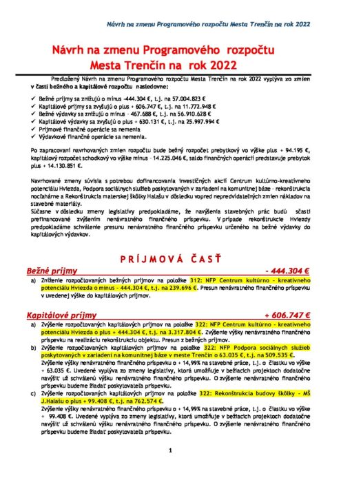 Hlavná stránka > Samospráva > Transparentný Trenčín > Rozpočet mesta > Rozpočet mesta – rok 2022 > Návrh na zmenu rozpočtu MsZ_august_2022