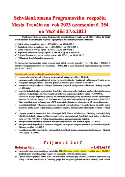 Hlavná stránka > Samospráva > Transparentný Trenčín > Rozpočet mesta > Rozpočet mesta – rok 2023 > Schválená zmena rozpočtu MsZ 27062023