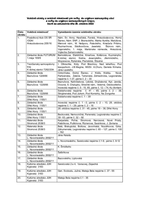 Hlavná stránka > Samospráva > Voľby > Spojené voľby do orgánov územnej samosprávy 2022 > Volebné okrsky a volebné miestnosti