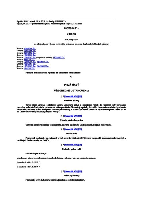 Zákon č.180/2014 Z.z. o podmienkach výkonu volebného práva a o zmene a doplnení niektorých zákonov v znení neskorších predpisov