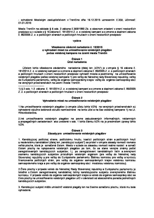 VZN č.13/2015 o vyhradení miest na umiestňovanie volebných plagátov počas volebnej kampane na území mesta Trenčín