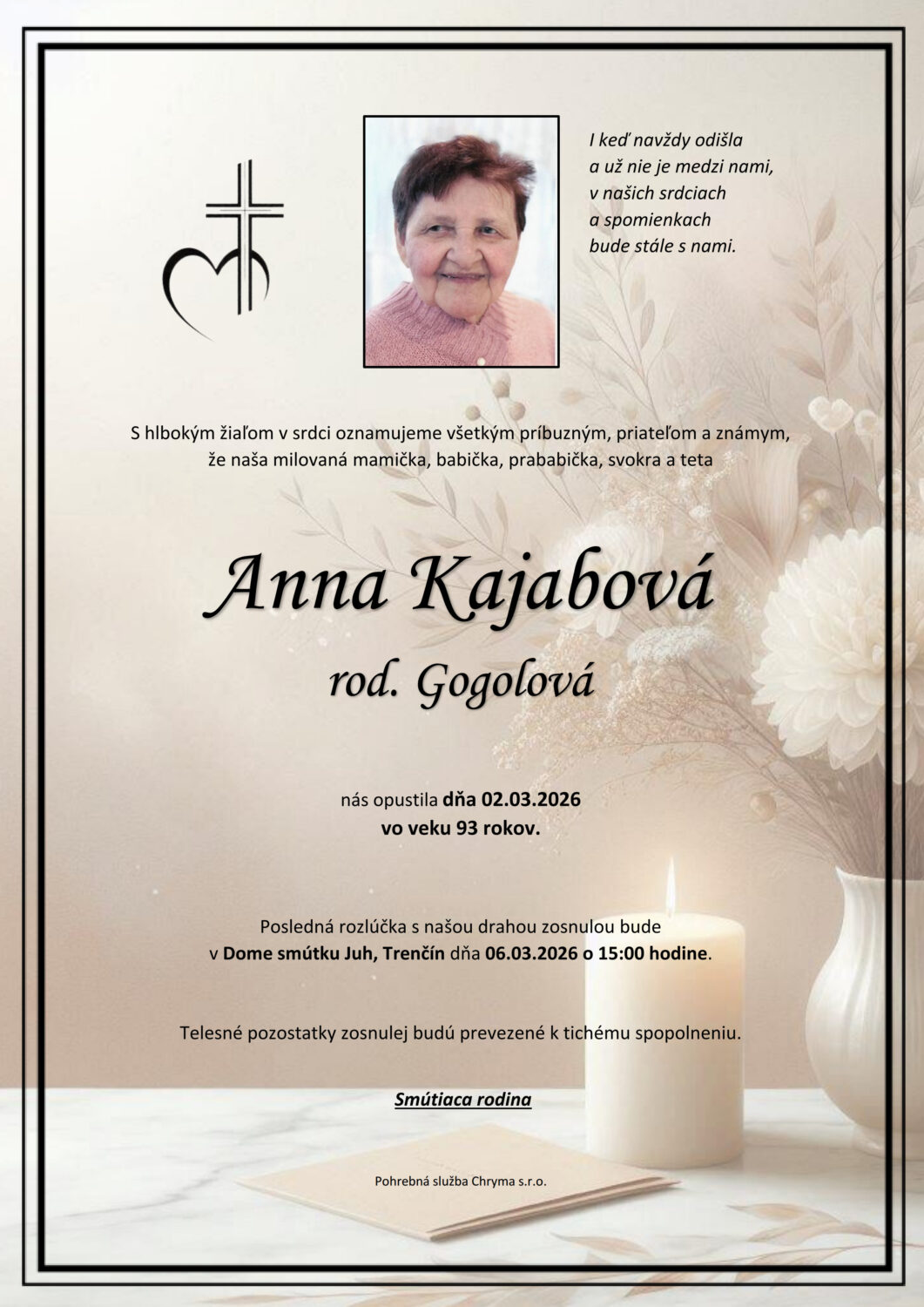 nás opustil(a) dňa: 02.03.2026, vo veku 93 rokov.