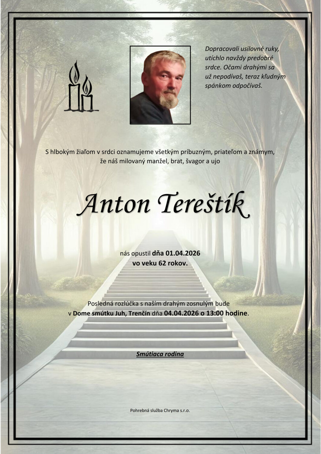 nás opustil(a) dňa: 01.04.2026, vo veku 62 rokov.
