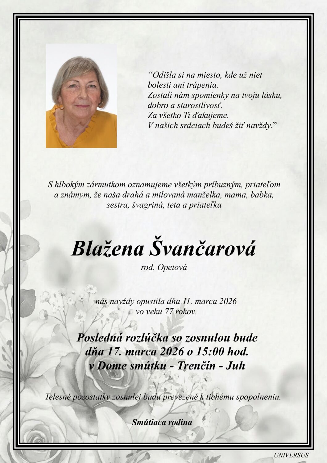 Posledná rozlúčka sa uskutoční dňa: 17.03.2026.