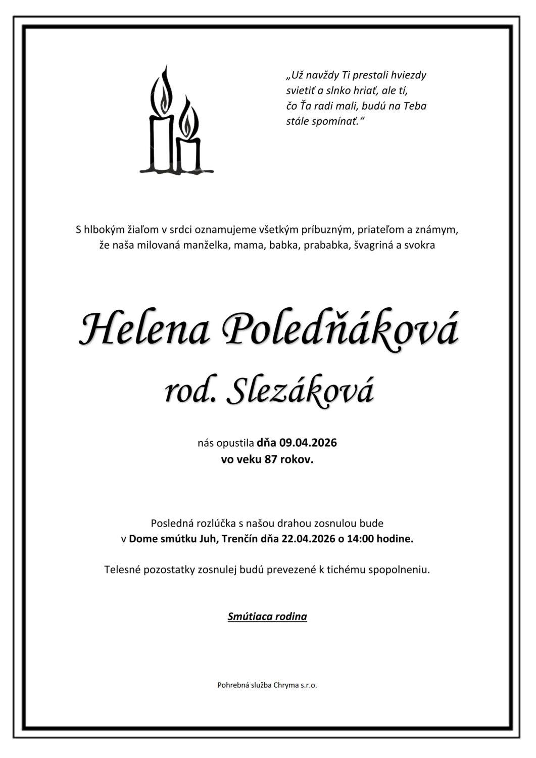nás opustil(a) dňa: 09.04.2026, vo veku 87 rokov.