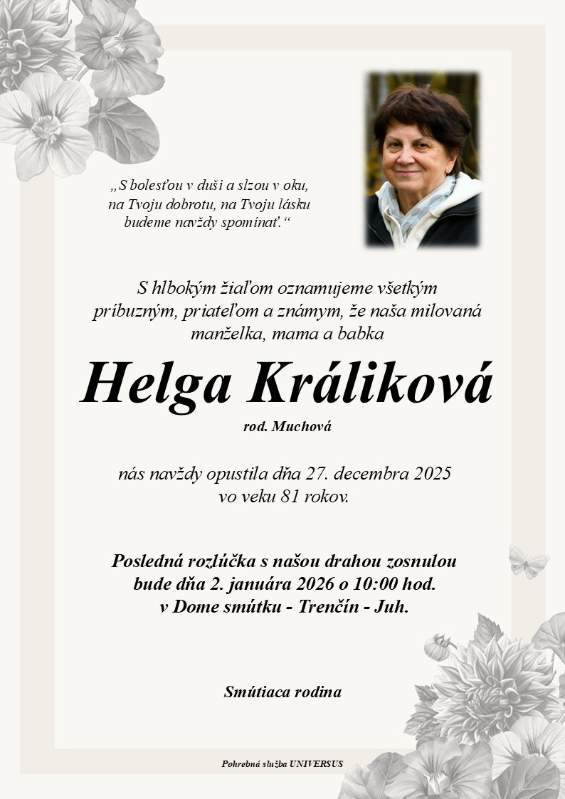nás opustil(a) dňa: 27.01.2026, vo veku 81 rokov.