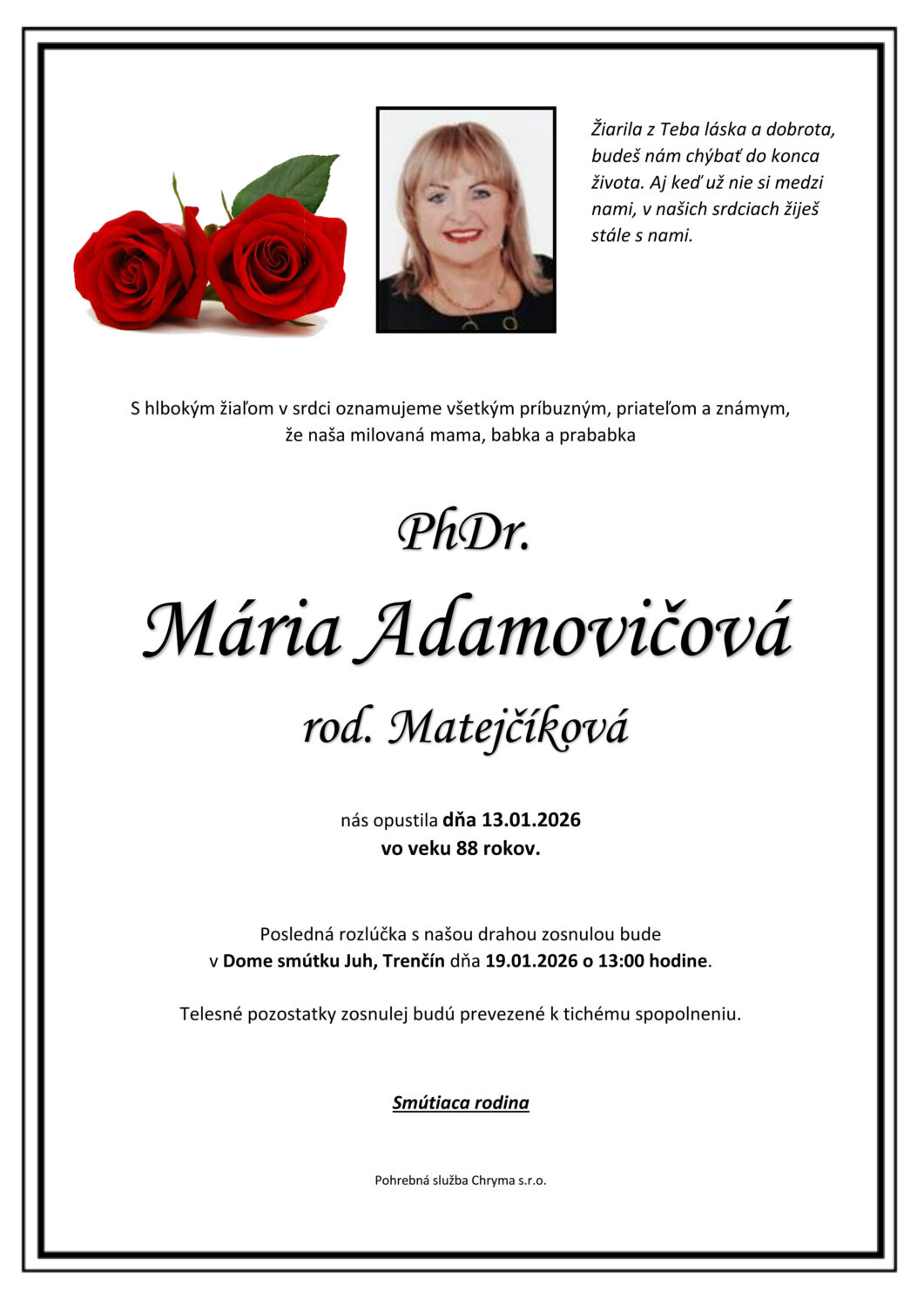Posledná rozlúčka sa uskutoční dňa: 19.01.2026.