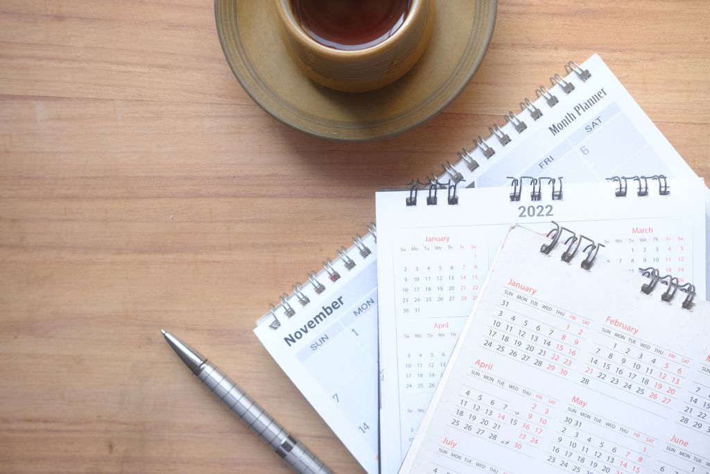 deadline concept with stack of calendar and pencil on color background